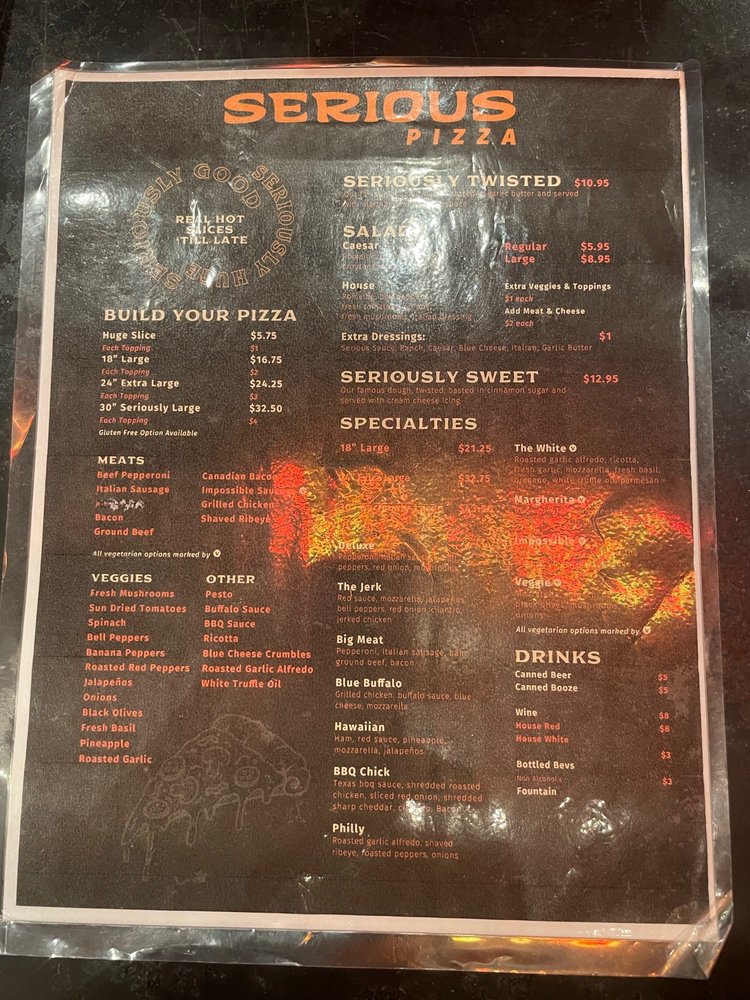 The Seriously Sweet dessert—a cinnamon sugar-dusted dough served with cream cheese icing—adds a delightful finish to your meal. Whether you're grabbing a late-night snack or celebrating a birthday with a large group, Serious Pizza embodies a welcoming atmosphere, offering both indoor and outdoor seating. Customer reviews highlight attentive service and the satisfaction of a perfectly baked pie, guaranteed to leave you craving more.